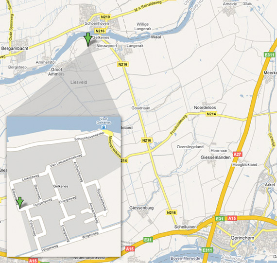 From Gorinchem: continue towards direction Schoonhoven on the N216; until the sign “Het Ooievaarsdorp” where you turn left. Then take the last road to the right before the sign “Ooievaarsdorp”, which will take you to the Edisonweg, where we are located on number 3.